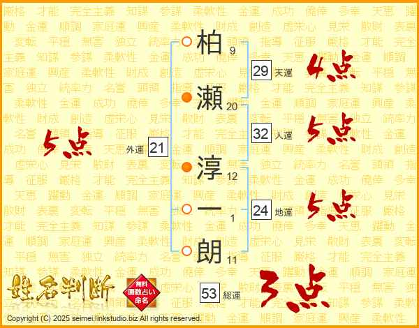 柏(9画)瀬(20画) 淳(12画)一(1画)朗(11画)
