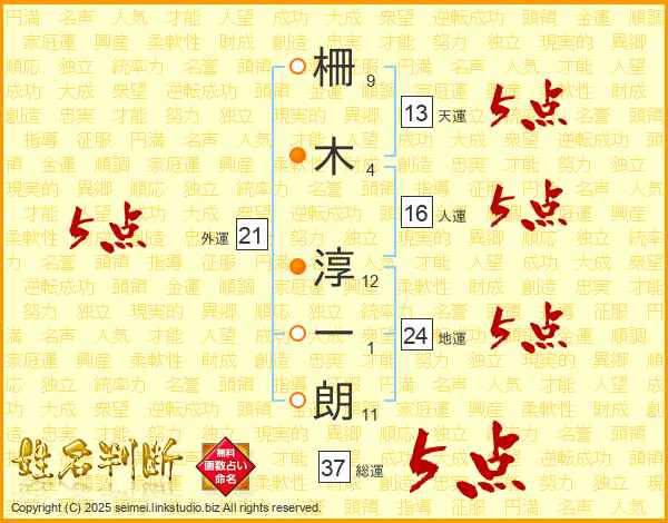 柵(9画)木(4画) 淳(12画)一(1画)朗(11画)