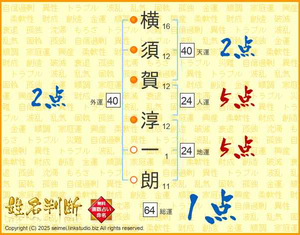 横(16画)須(12画)賀(12画) 淳(12画)一(1画)朗(11画)