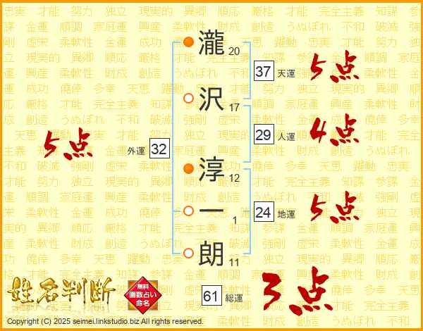 瀧沢淳一朗さんの外運は32画の5点!