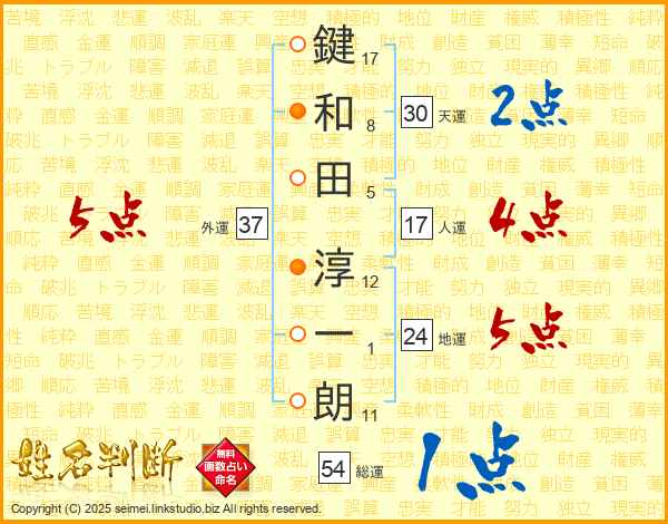 鍵(17画)和(8画)田(5画) 淳(12画)一(1画)朗(11画)