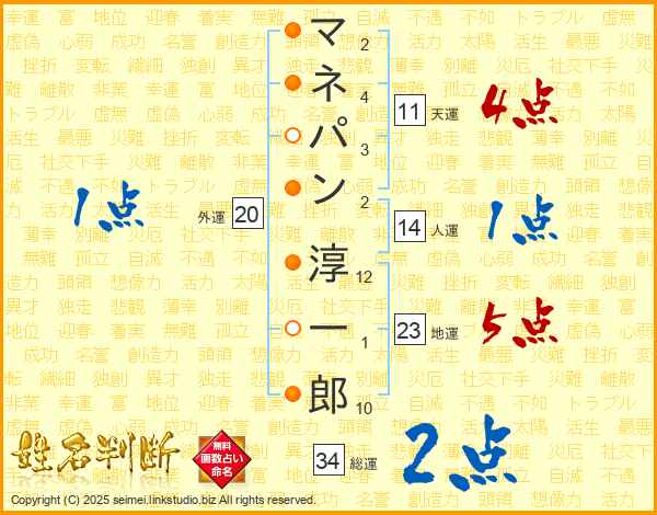 マ(2画)ネ(4画)パ(3画)ン(2画) 淳(12画)一(1画)郎(10画)