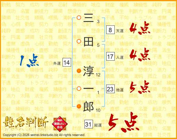 三(3画)田(5画) 淳(12画)一(1画)郎(10画)