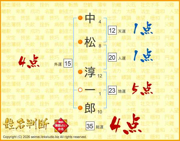 中(4画)松(8画) 淳(12画)一(1画)郎(10画)