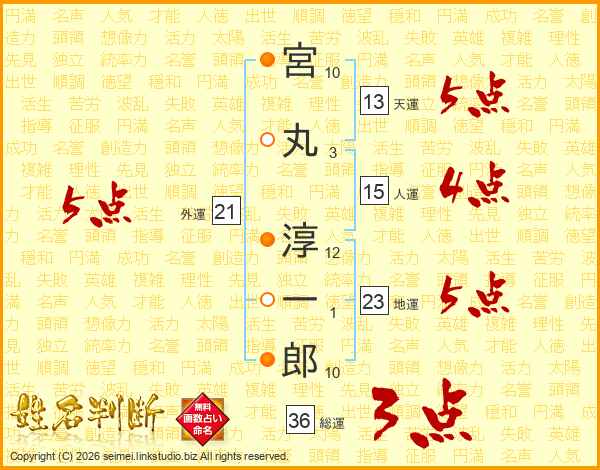 宮(10画)丸(3画) 淳(12画)一(1画)郎(10画)