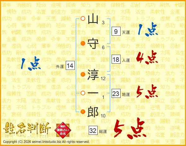 山(3画)守(6画) 淳(12画)一(1画)郎(10画)