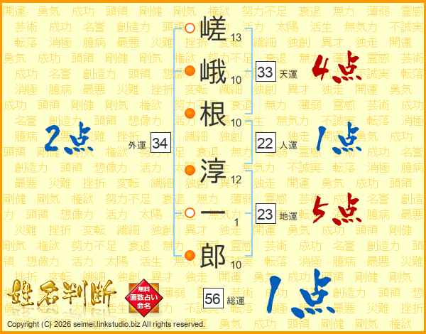嵯(13画)峨(10画)根(10画) 淳(12画)一(1画)郎(10画)