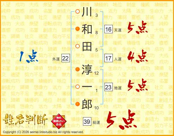 川(3画)和(8画)田(5画) 淳(12画)一(1画)郎(10画)