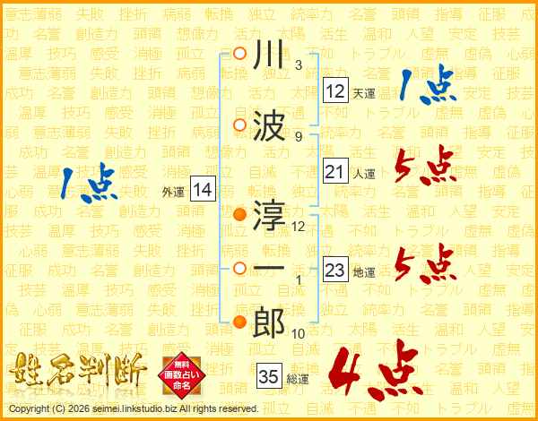 川(3画)波(9画) 淳(12画)一(1画)郎(10画)