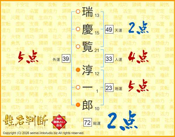 瑞(13画)慶(15画)覧(21画) 淳(12画)一(1画)郎(10画)