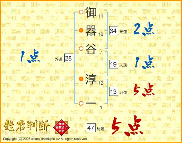 御(11画)器(16画)谷(7画) 淳(12画)一(1画)