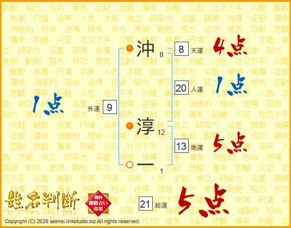 生活面を象徴する運勢です。外部から受ける影響力を表し、結婚運、家庭運や職場、環境への順応性を表します。総運から人運を引いた画数。姓や名が1文字の場合を除く。