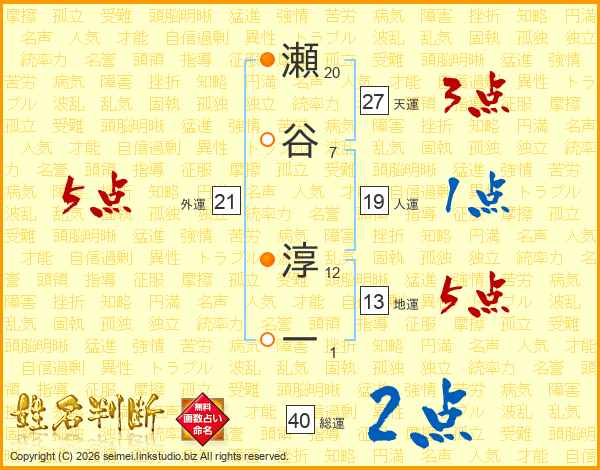 瀬(20画)谷(7画) 淳(12画)一(1画)
