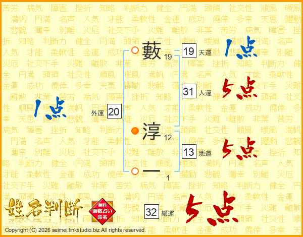 藪淳一さんの総運は32画の5点!