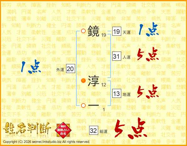 生活面を象徴する運勢です。外部から受ける影響力を表し、結婚運、家庭運や職場、環境への順応性を表します。総運から人運を引いた画数。姓や名が1文字の場合を除く。