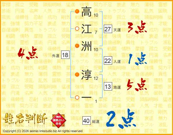 高(10画)江(7画)洲(10画) 淳(12画)一(1画)