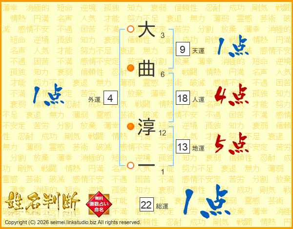 生活面を象徴する運勢です。外部から受ける影響力を表し、結婚運、家庭運や職場、環境への順応性を表します。総運から人運を引いた画数。姓や名が1文字の場合を除く。