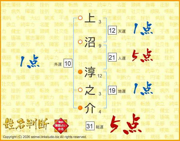 上(3画)沼(9画) 淳(12画)之(3画)介(4画)