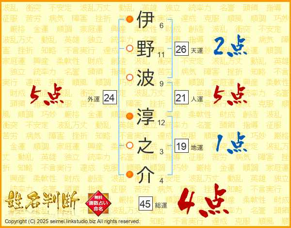 伊(6画)野(11画)波(9画) 淳(12画)之(3画)介(4画)