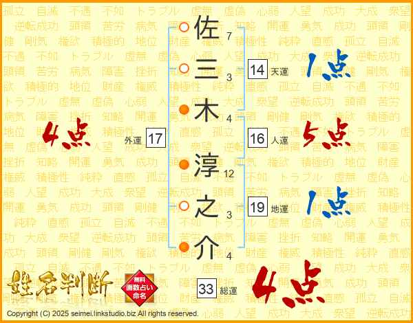 佐(7画)三(3画)木(4画) 淳(12画)之(3画)介(4画)