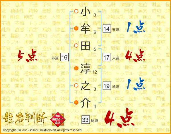 小(3画)牟(6画)田(5画) 淳(12画)之(3画)介(4画)