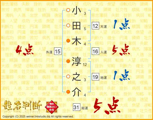 小(3画)田(5画)木(4画) 淳(12画)之(3画)介(4画)