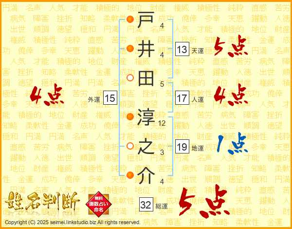 戸井田淳之介さんの総運は32画の5点!