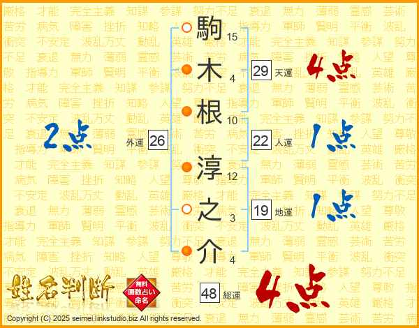 駒(15画)木(4画)根(10画) 淳(12画)之(3画)介(4画)