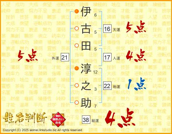 伊(6画)古(5画)田(5画) 淳(12画)之(3画)助(7画)