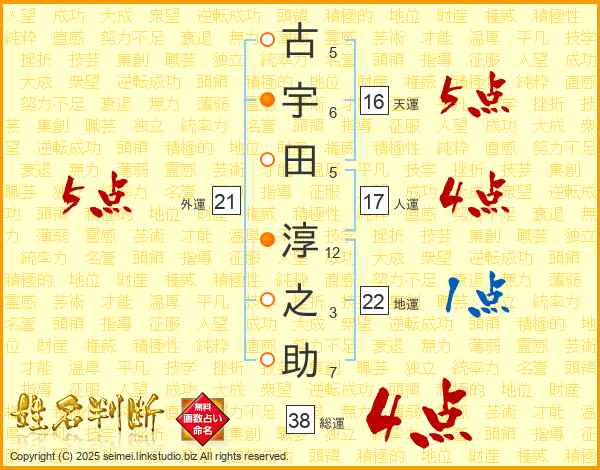古(5画)宇(6画)田(5画) 淳(12画)之(3画)助(7画)