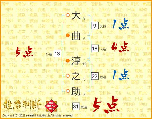 大(3画)曲(6画) 淳(12画)之(3画)助(7画)