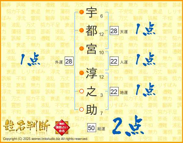 宇(6画)都(12画)宮(10画) 淳(12画)之(3画)助(7画)