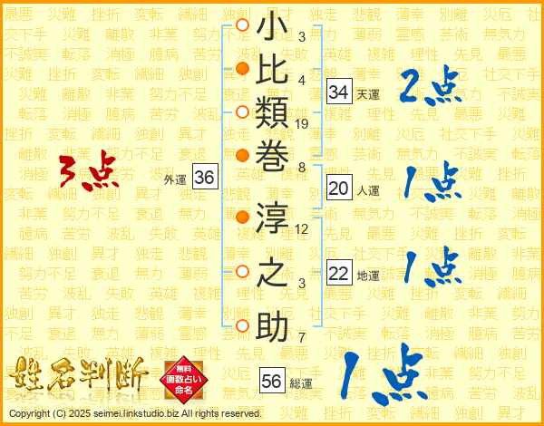 小(3画)比(4画)類(19画)巻(8画) 淳(12画)之(3画)助(7画)