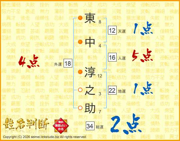 東(8画)中(4画) 淳(12画)之(3画)助(7画)