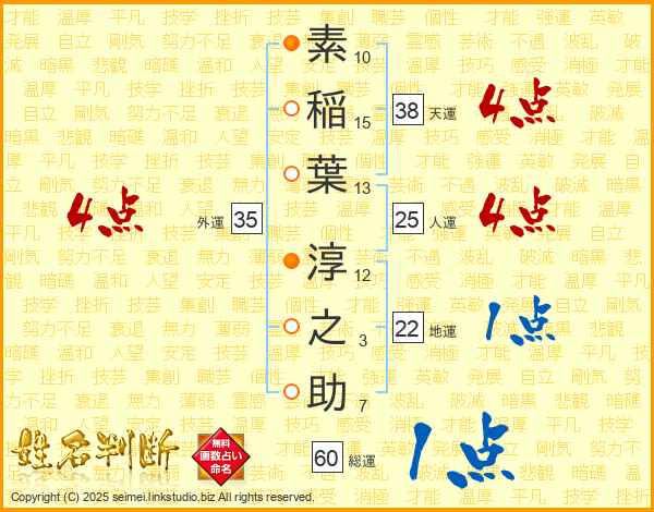 素(10画)稲(15画)葉(13画) 淳(12画)之(3画)助(7画)