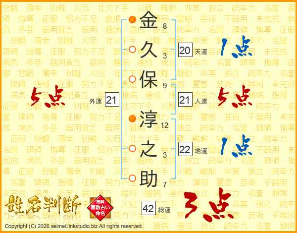 金久保淳之助さんの人運は21画の5点!