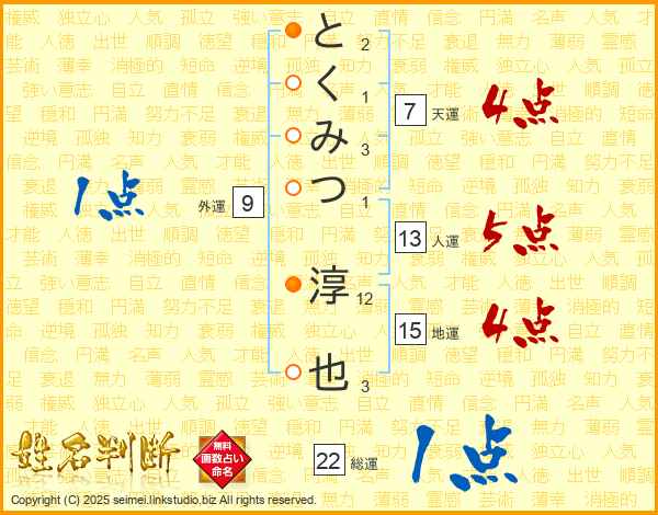 とくみつ淳也さんの総運は22画の1点!