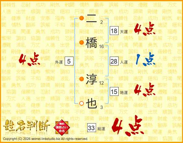 二橋淳也さんの総運は33画の4点!