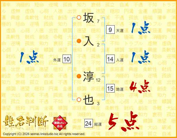 坂入淳也さんの総運は24画の5点!