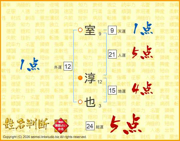 室(9画) 淳(12画)也(3画)