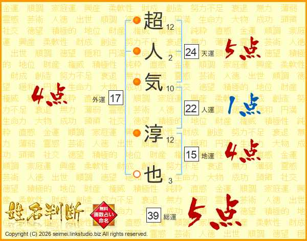 超人気淳也さんの総運は39画の5点!