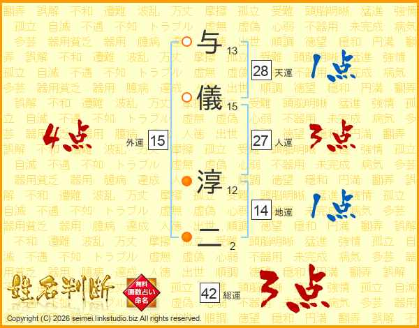生活面を象徴する運勢です。外部から受ける影響力を表し、結婚運、家庭運や職場、環境への順応性を表します。総運から人運を引いた画数。姓や名が1文字の場合を除く。