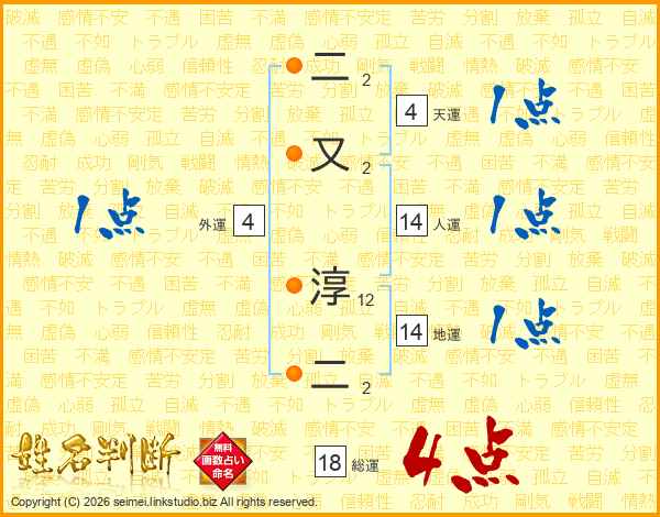 生活面を象徴する運勢です。外部から受ける影響力を表し、結婚運、家庭運や職場、環境への順応性を表します。総運から人運を引いた画数。姓や名が1文字の場合を除く。