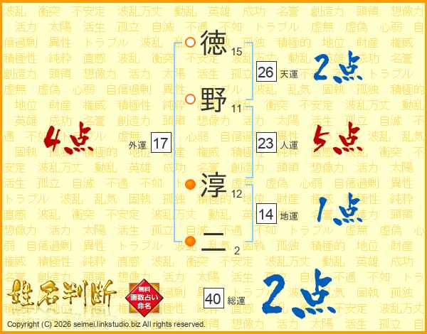 徳(15画)野(11画) 淳(12画)二(2画)