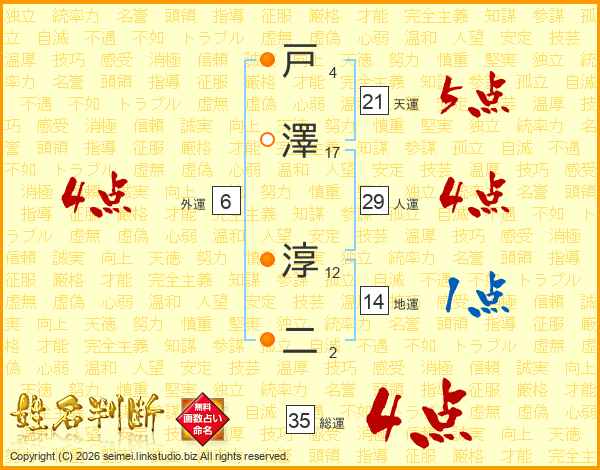 戸(4画)澤(17画) 淳(12画)二(2画)