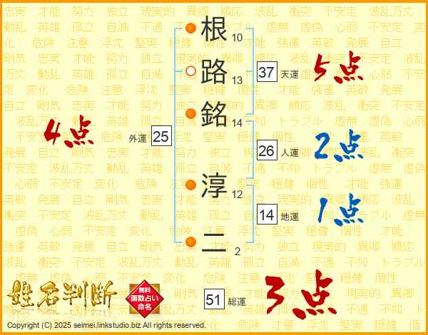 根(10画)路(13画)銘(14画) 淳(12画)二(2画)