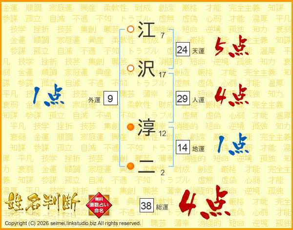 生活面を象徴する運勢です。外部から受ける影響力を表し、結婚運、家庭運や職場、環境への順応性を表します。総運から人運を引いた画数。姓や名が1文字の場合を除く。