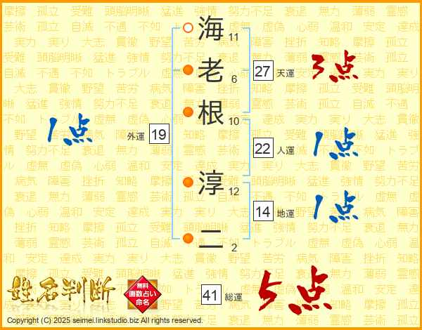 生活面を象徴する運勢です。外部から受ける影響力を表し、結婚運、家庭運や職場、環境への順応性を表します。総運から人運を引いた画数。姓や名が1文字の場合を除く。