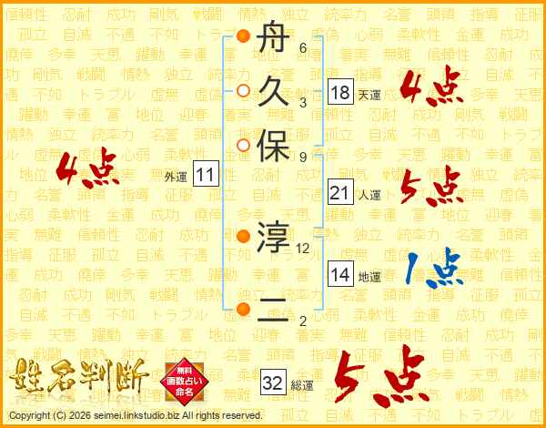舟(6画)久(3画)保(9画) 淳(12画)二(2画)