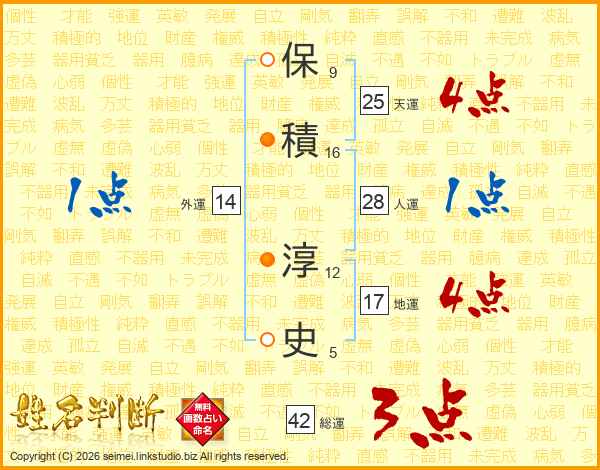 保(9画)積(16画) 淳(12画)史(5画)